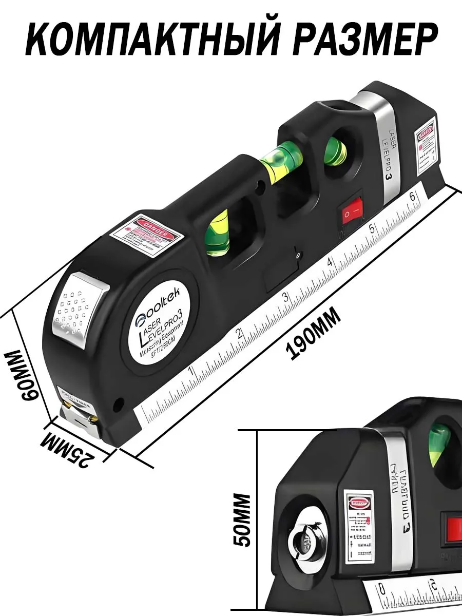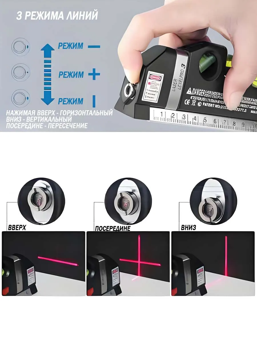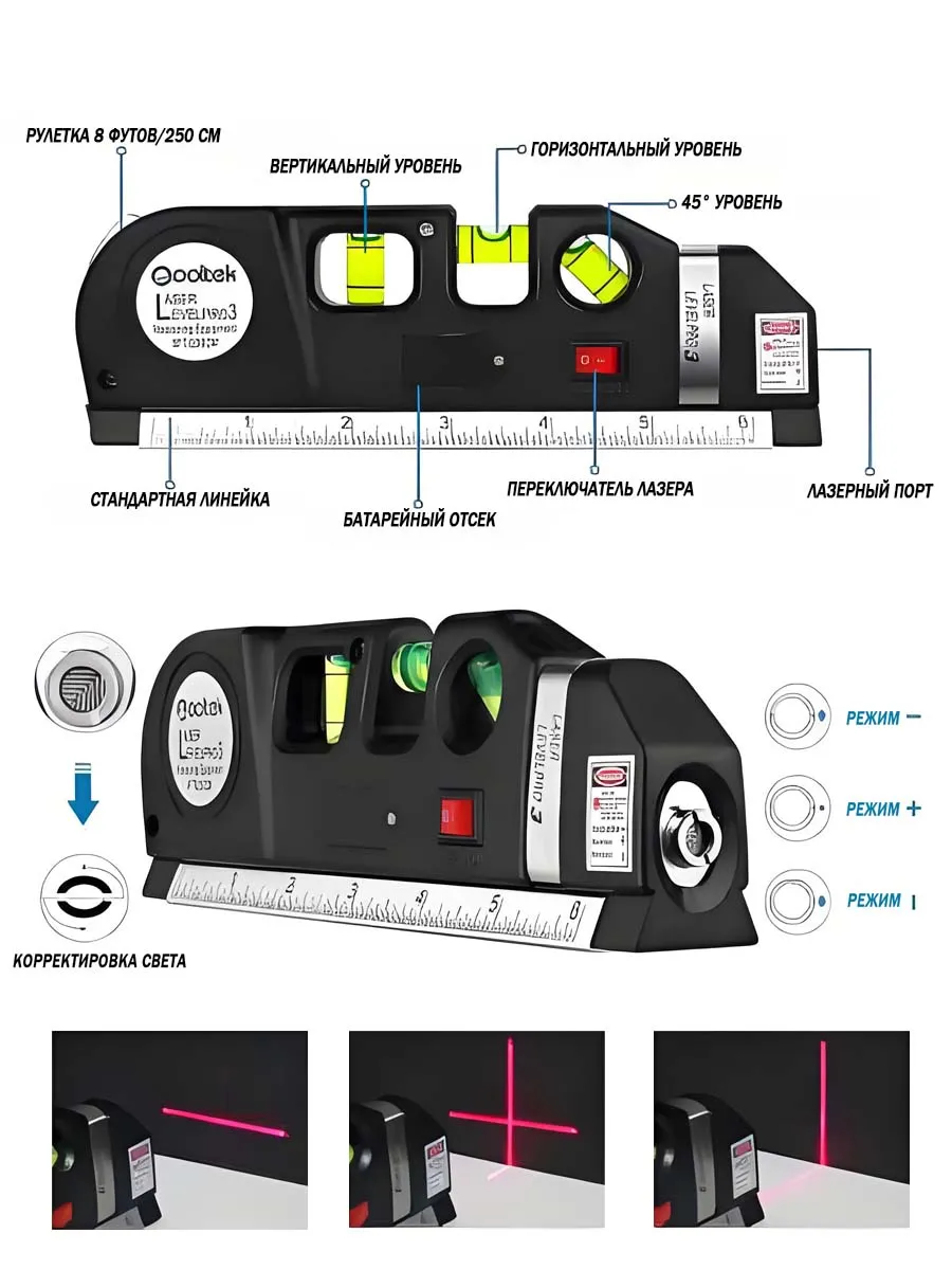 Лазерный уровень-нивелир с рулеткой - незаменимый помощник для любых строительных и ремонтных работ. Он проецирует четкие линии в горизонтальной, вертикальной плоскостях и крестом, позволяя быстро и точно выполнять разметку для полок, картин, плитки и других элементов.