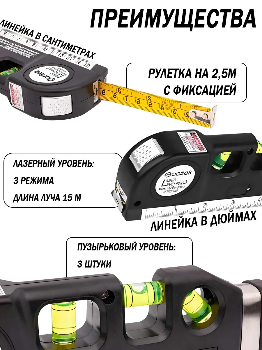 Благодаря встроенной рулетке длиной 2,5 м (или 1,5 м в другой версии) вы получаете два инструмента в одном. Прочная алюминиевая платформа обеспечивает устойчивость на любой ровной поверхности без необходимости использования треноги, что делает работу еще удобнее.